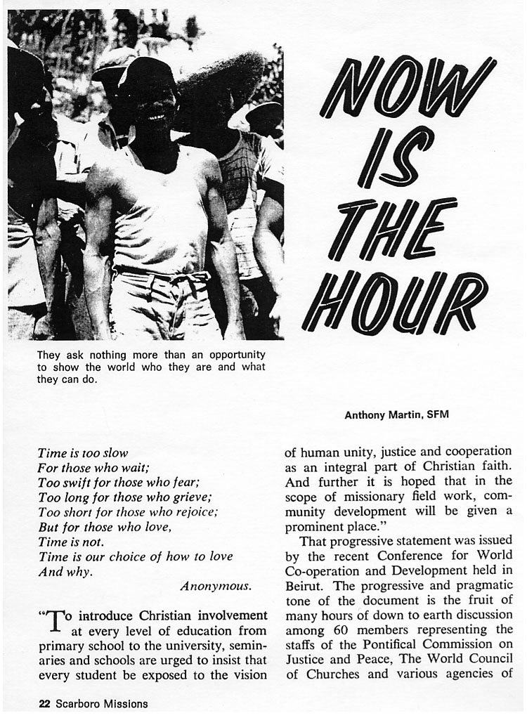 Tony Martin wrote 2 articles, "Philippine Report" (Dec 1967) and "Now is the Hour" (Jan 1969) published in the Scarboro Missions Magazine;