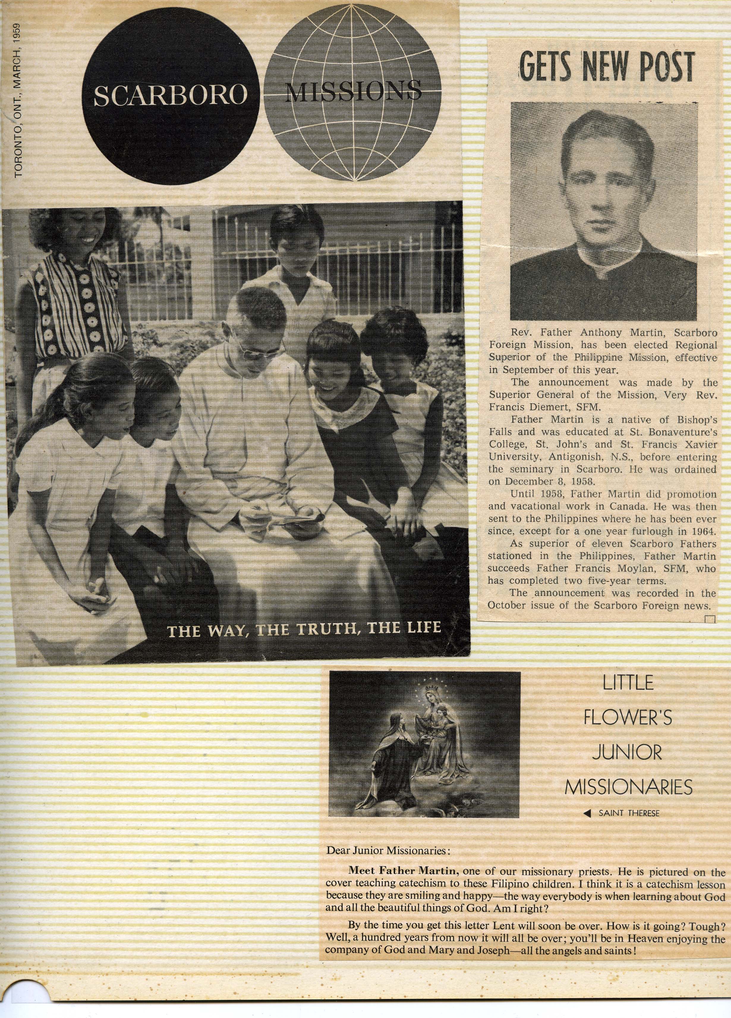 "Posted to the Philippines" (from Vocation Triduum Scores Big Hit!) Scarboro Missions Vol 39 No 6 (June 1958) p. 3