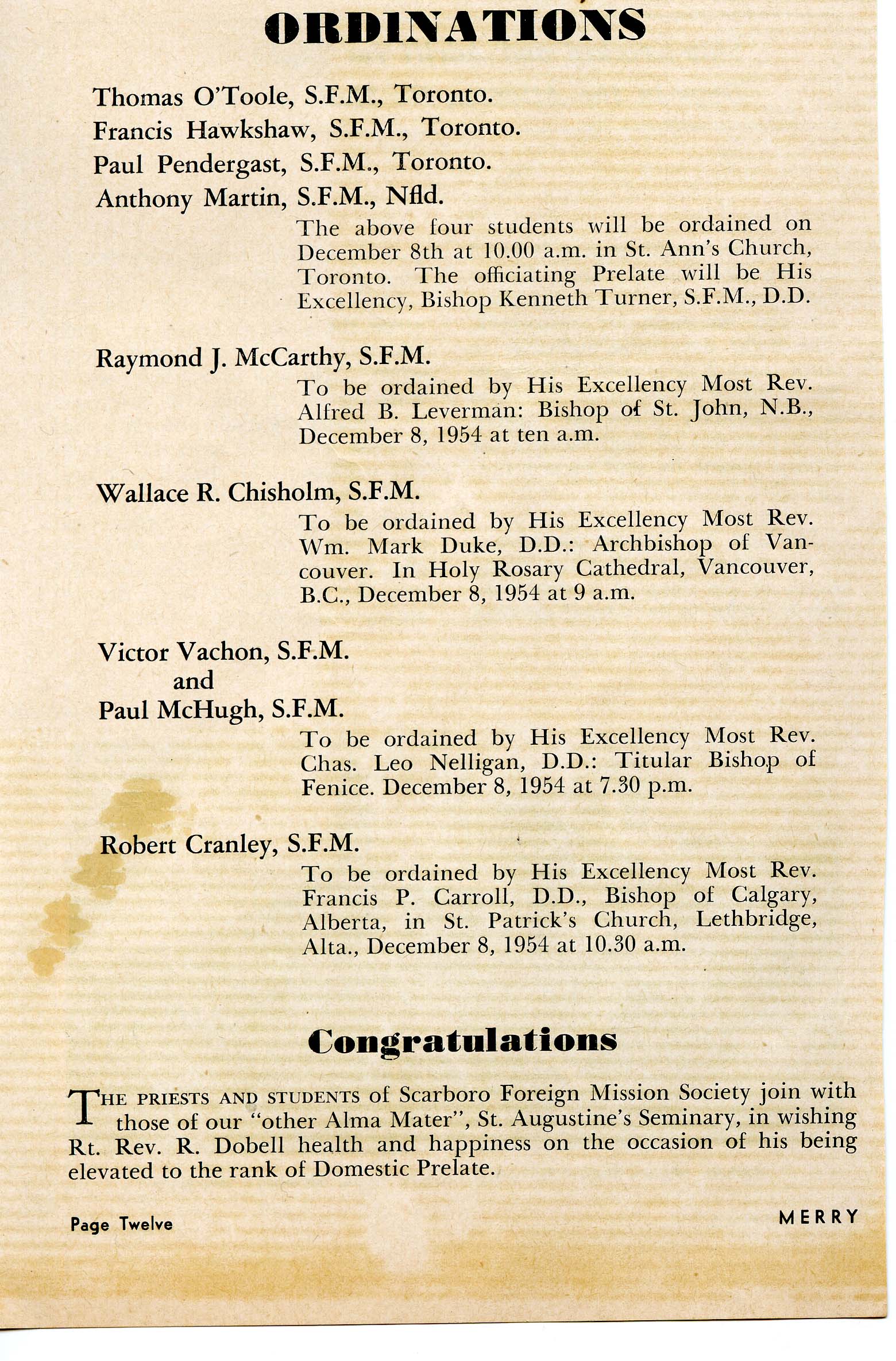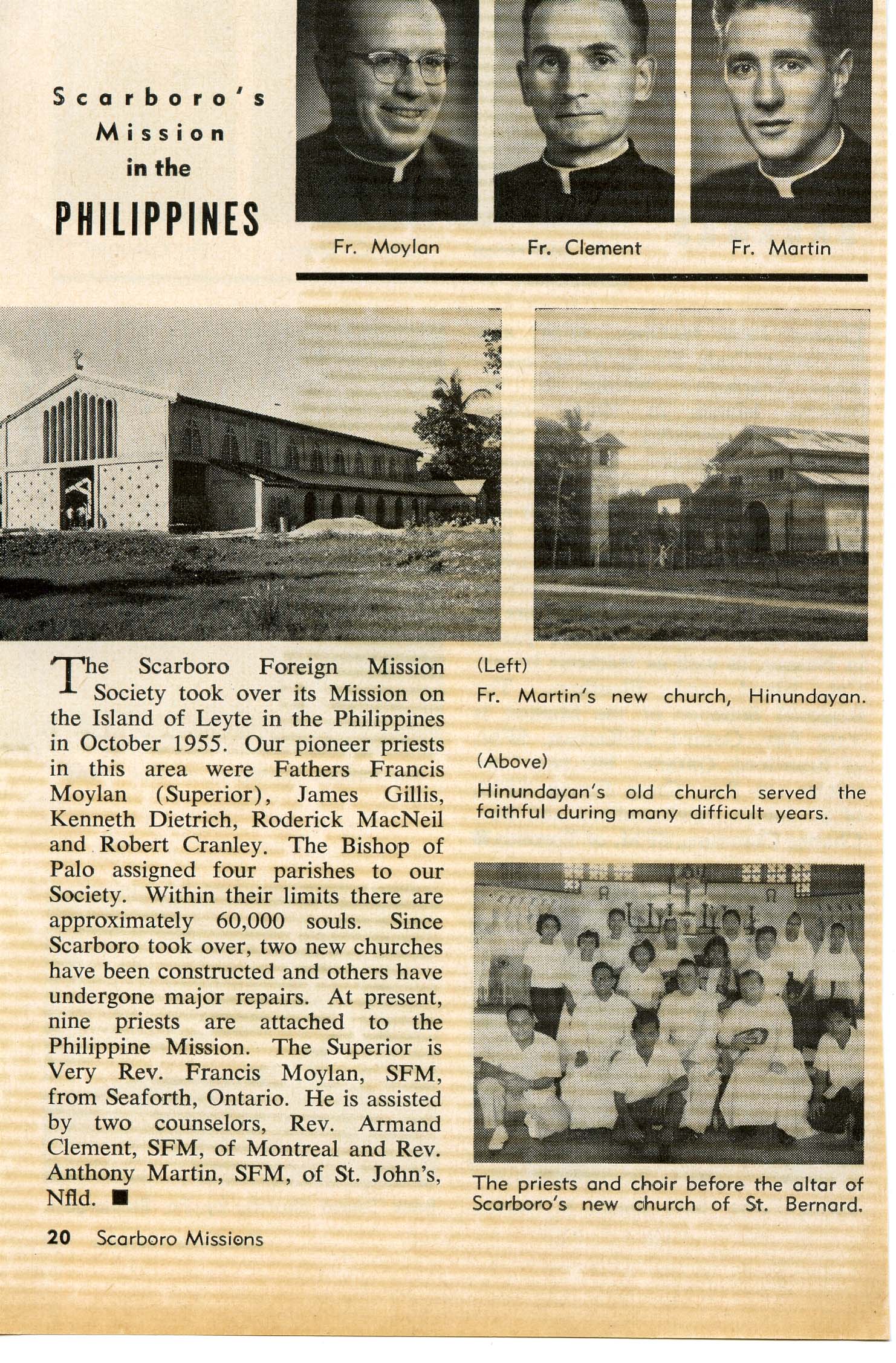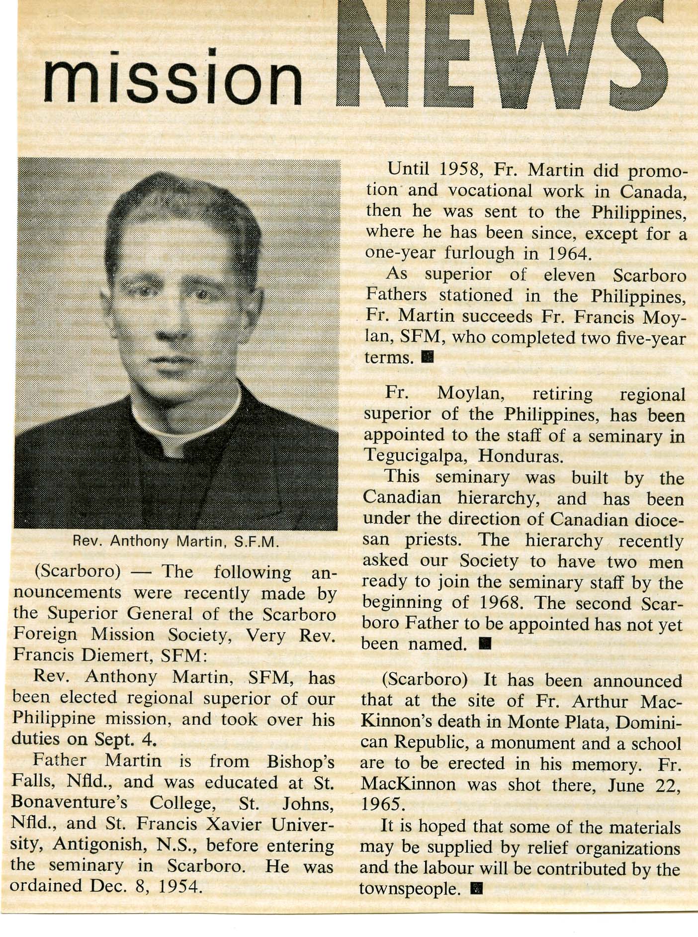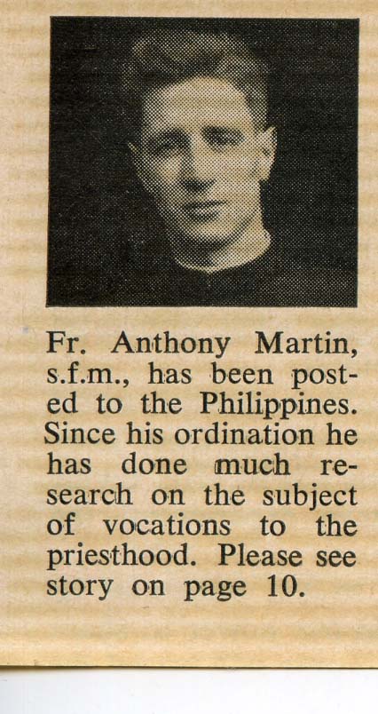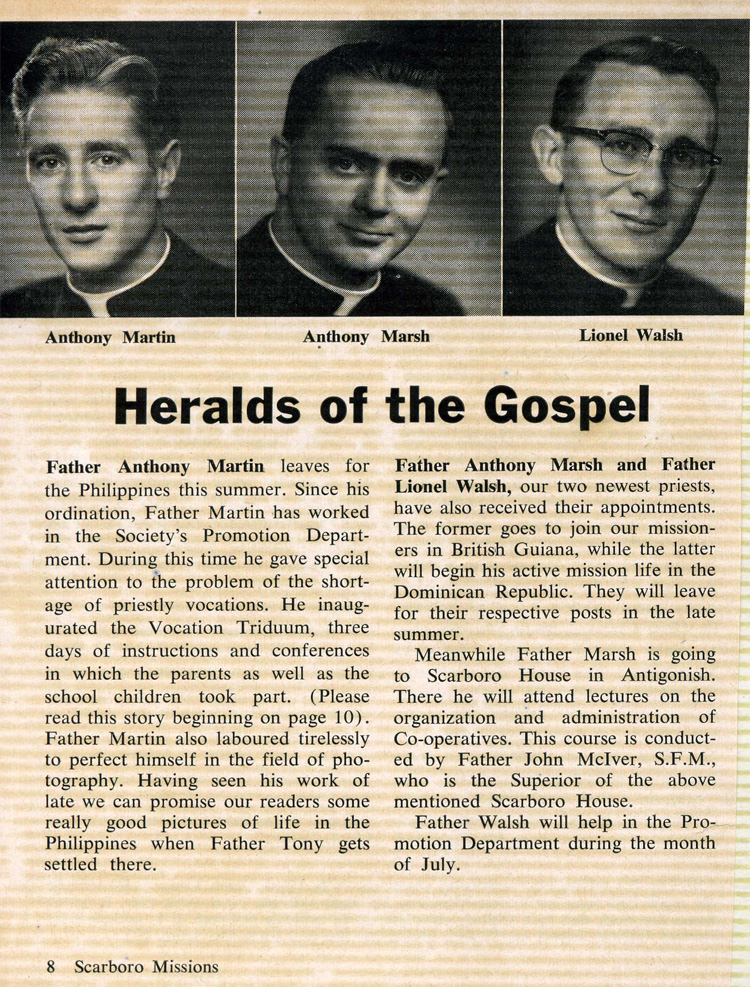 "Posted to the Philippines" (from Vocation Triduum Scores Big Hit!) Scarboro Missions Vol 39 No 6 (June 1958) p. 3